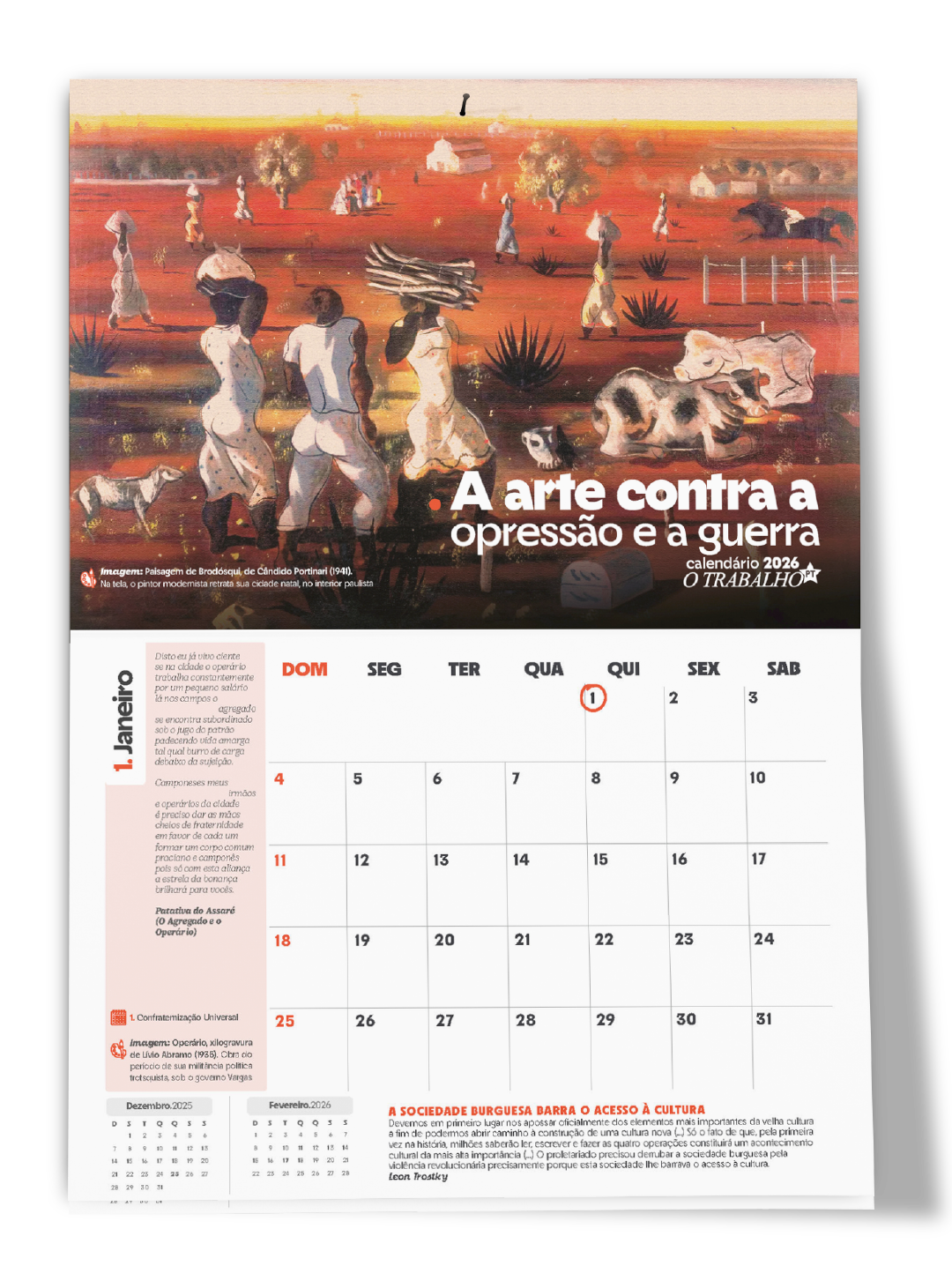 No panorama da arte moderna brasileira, diretamente influenciada pelos movimentos internacionais, Portinari é considerado por muitos como o principal nome das artes plásticas. Seu panorama da cidade natal que abre o nosso calendário, Paisagem de Brodósqui (SP), retrata a cor vermelha da fértil terra daquela região do Estado e sua presença humana, marcada pelo trabalho da população negra. A obra Descoberta do Ouro volta ao tema do trabalho, enquando Dança de Roda integra o mural Paz (conjunto Guerra e Paz), feito para a sede da ONU. Deixou quase 5 mil obras. Morreu pela intoxicação do chumbo presente nas tintas com as quais trabalhou toda a vida.